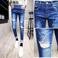 步来褶惠2017新款春季潮男韩版修身破洞补丁牛仔裤潮男小脚裤牛仔长裤青年蓝色夏