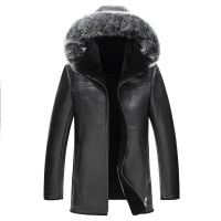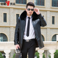 新款皮毛一体男装夹克海宁真皮皮衣中长款连带帽修身冬季加厚黑色