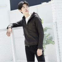 2017新品时尚真皮皮衣男连帽皮夹克修身韩版青年男士皮衣外黑色