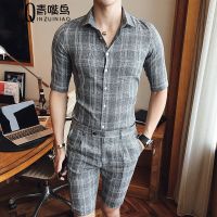 尊首新款2017潮流夏季男士中袖衬衫五分袖衬衣男修身格子七分袖寸衫衫衣短袖衬