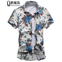 步来褶惠2017夏季新款男士短袖花衬衫加肥加大码胖子寸衣青年半袖衬衣宽松蓝色夏