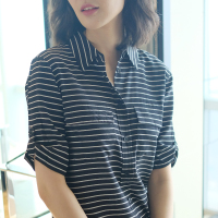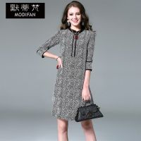 默蒂梵2017夏季新款欧美宽松中裙子桑蚕丝五分袖条纹真丝印花连衣裙灰色