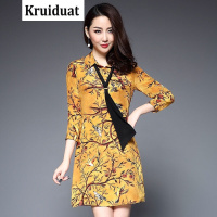 Kruidvat17年新款欧美翻领印花连衣裙七分袖宽松休闲中裙真丝裙子Z011黄色