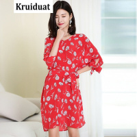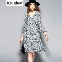 Kruidvat印花真丝2017春夏女装新款V领喇叭袖中裙AGH