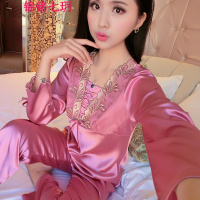 锦铭七玥春秋新款女款长袖休闲仿真丝绣花性感睡衣套装居服厂