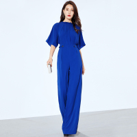 宝蓝色雪纺连体阔腿裤女裤2018夏季新款高腰长裤宽松连体衣