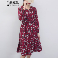 步来褶惠2017春夏季新品韩版长裙a字碎花中长款裙子星星雪纺长袖连衣裙女夏酒红色夏