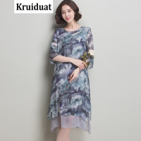 Kruidvat2017夏季新款女式圆领五分袖印花中长款雪纺连衣裙M018