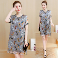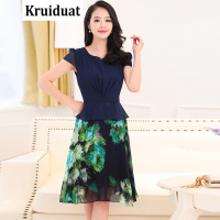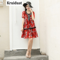 Kruidvat夏季新款中年女装雪纺连衣裙印花大摆收腰显廋短袖2017Z003