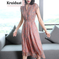 奈琴尔名媛气质v领短袖雪纺中长裙2017夏新款修身显瘦印花雪纺连衣裙女花色