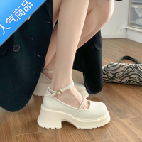 SUNTEK白色玛丽珍高跟鞋女夏季一字带粗跟厚底圆头小皮鞋小个子包头凉鞋