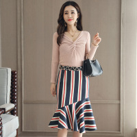 秋冬交叉V领裹胸长袖修身显瘦连衣裙包臀裙套装女鱼尾裙子两件套图片色