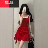 YIBUSHENG收腰显瘦法式复古红色海边度假短裙子女纯欲辣妹不规则吊带连衣裙