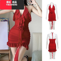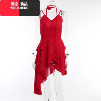 YIBUSHENG季性感辣妹泰式连衣裙女不规则小众设计女团荷叶边红色飘带裙子