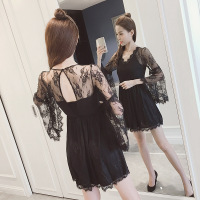 珂依舍2017秋装新款性感潮镂空露背宽松长袖喇叭袖显瘦蕾丝收腰连衣裙百搭