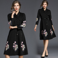2017欧美秋冬新款女装九分袖时尚刺绣系带收腰显瘦连衣裙黑色