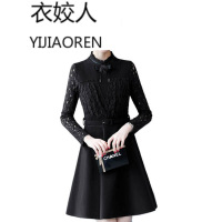 衣姣人(YIJIAOREN) 初高中学生时尚少女秋冬新款2018连衣裙女韩版收腰时尚显瘦蕾丝拼接毛呢加厚打底 黑色 收藏