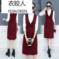 衣姣人(YIJIAOREN) 2017秋冬季女加厚保暖百搭冬裙冬天毛衣加裙子背带毛呢连衣裙两件套装 酒红+黑毛衣 S