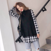 2018春新款连衣裙新款高领网红衬衫女毛衣背心+格子衬衫两件套CYLLHYY