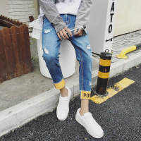YANXU牛仔裤男士夏季薄款潮牌破洞2023新款修身直筒休闲九分裤子男