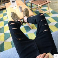 YANXU黑色破洞牛仔裤男款夏季薄款修身小脚铅笔九分漏洞休闲裤子男