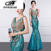 晚礼服2017新款 宴会年会金色亮片修身鱼尾长款主持人V领礼服女