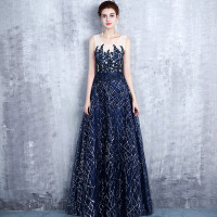 宴会晚礼服女秋季新款优雅藏青色生日派对亮片晚宴连衣裙长款藏青色