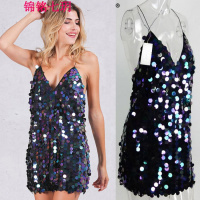 锦铭七玥2017欧美秋季新款深V露背吊带连衣裙 性感礼服夜店亮片短裙女