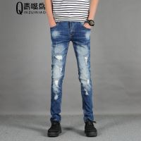 莞馨2017春新款青年破洞牛仔裤时尚小脚裤弹力修身潮个性休闲牛仔裤蓝色