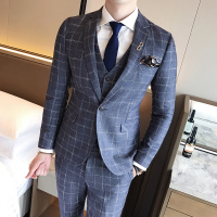 西服套装男士英伦西装男套装三件套韩版修身新郎结婚礼服格子商务蓝色格