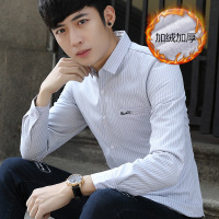 【】男士长袖衬衫冬季潮流加绒加厚条纹衬衣休闲保暖衬衫