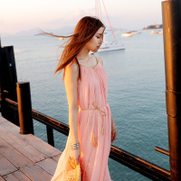 旗下夏季新款波西米亚吊带重磅雪纺海边度假宽松大摆沙滩裙长款连衣裙 粉红色 均码