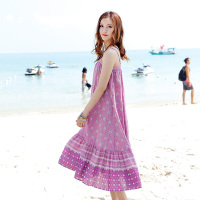 旗下夏季波西米亚纯棉海边度假定位花吊带沙滩裙中长款连衣裙紫色