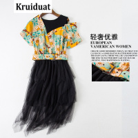 Kruidvat2017欧美女装夏季假两件印花裙拼接网纱a字裙BT