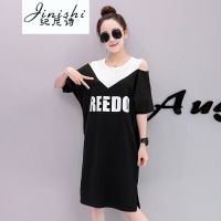 纪尼诗女装2017夏季新款休闲时尚个性字母漏肩拼色连衣裙