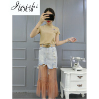 纪尼诗女装2017韩版夏季新款简约T恤加水洗破洞牛仔裙加网纱裙三件套时尚休闲装