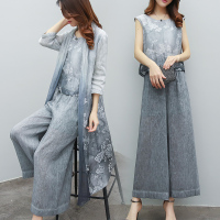 尊首新款2017年夏季时尚优雅甜美套装套裙七分袖印花短外套+圆领无夏
