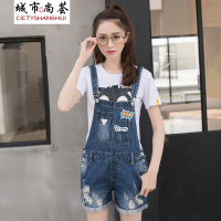 新款无弹手工割破徽章纽扣学院风牛仔背带短裤女