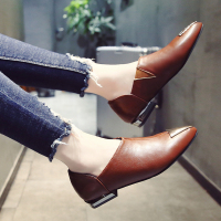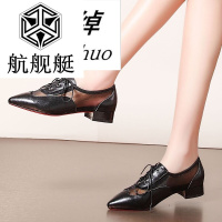 2017新款英伦尖头复古低跟系带女单鞋粗跟深口网纱真皮百搭休闲鞋女鞋子