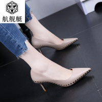 韩版中高跟铆钉单鞋女2017秋季新款尖头细跟浅口女鞋OL百搭工作鞋