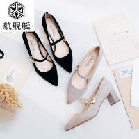 玛丽珍单鞋女尖头黑色高跟鞋秋季2017新款中跟百搭粗跟女鞋