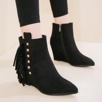 短靴女坡跟尖头女靴铆钉 牛皮流苏高跟女鞋时尚鞋子 2017秋冬新款
