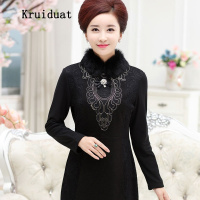 Kruidvat 奈琴尔16秋款中老年妈妈装长款毛领加绒长袖女装打底裙修身保暖连衣裙FZ