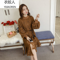 衣姣人(YIJIAOREN) 2018女装冬装新款长袖荷叶边加厚中长款显瘦打底蕾丝连衣裙