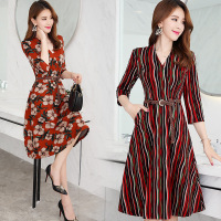 莞馨长袖连衣裙高腰显瘦修身2017春秋新款中长款气质名媛印花打底裙子
