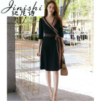纪尼诗女装韩版2018夏季女装新款高腰修身显瘦V领名媛黑色中长连衣裙片色送裹胸