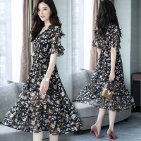 松紧腰领花色雪纺花瓣袖拉链大摆型年夏季短袖中长款连衣裙