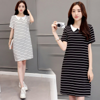 YIBUSHENG2024年季新款法式拉链翻领短袖宽松条纹针织连衣裙女小个子长裙