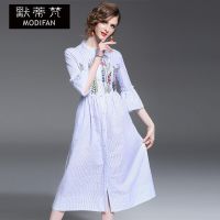 默蒂梵服饰2017春夏女装新款欧美时尚绣花单排扣衬衫式连衣裙蓝色