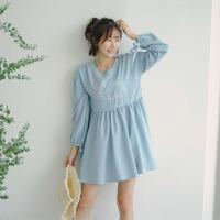 2017新款瞌睡兔刺绣字母少女清新蓝色连衣裙2017秋装新款宽松高腰娃娃裙